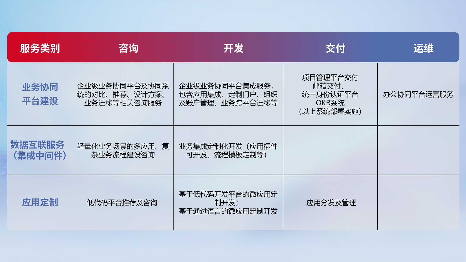 针对钉钉、、企微、、、IDaas等平台级产品提供产品的规划、、、、方案、、、、交付、、、、定制化开发等服务,,,实现如统一协同办公、、、、智能客户服务、、、、混合会议管理、、、智能数据查询、、等业务场景,,,实现数字化转型。。。。